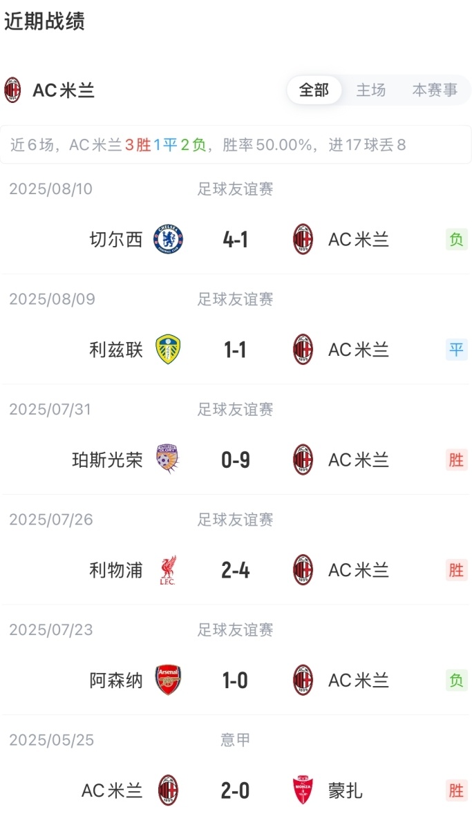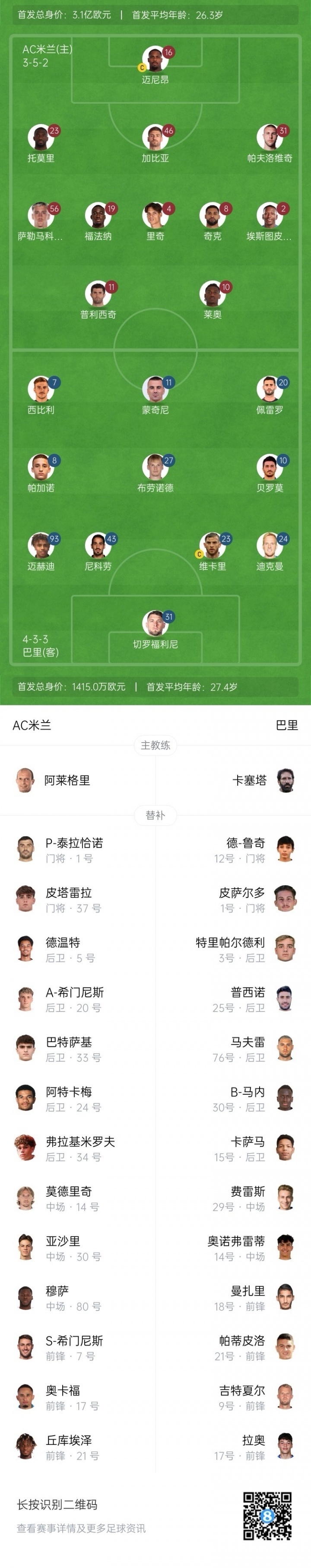 米兰首发:16-迈尼昂、31-帕夫洛维奇、46-加比亚、23-托莫里、2-埃斯图皮尼安、19-福法纳、4-里奇、8-奇克、56-萨勒马科尔斯、11-普利西奇、10-莱奥